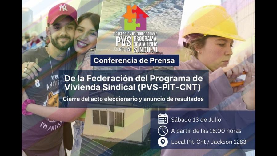 Desde la Federación del Programa de Vivienda Sindical (PVS) se convoca a conferencia de prensa con motivo de cierre del acto eleccionario y para dar a conocer los resultados del mismo. Las elecciones se realizan el próximo sábado 13 de julio de 9 a 16 hs en el local del PIT-CNT. Estará habilitado para realizar imágenes en el horario de 11 a 12 hs.