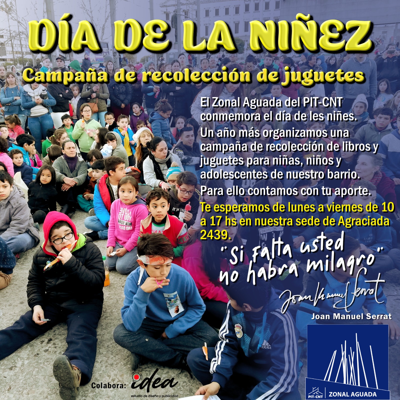 Como en todos los años, una vez más el Zonal Aguada del PIT-CNT en el barrio de La Aguada festeja el Día del Niño y en el marco de la pandemia, la propuesta está dirigida a todos los que quieran motivar sus sonrisas. En entrevista con la dirigente nacional del SUTCRA (Sindicato Único del Transporte de Cargas y Ramas Afines) y responsable del zonal del PIT-CNT en La Aguada, Viviana Núñez, nos informa sobre la organización que se está llevando a cabo.
