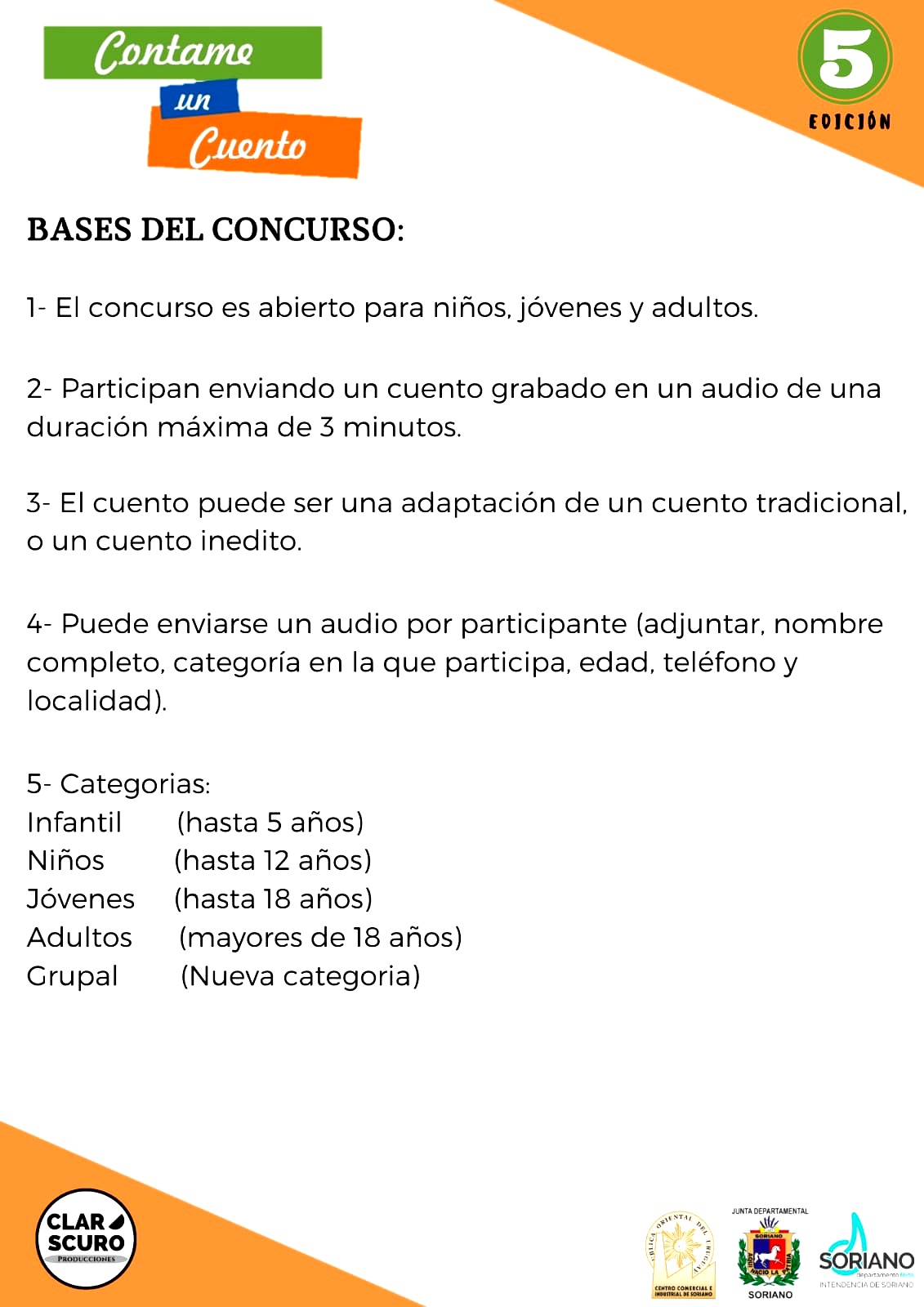 4. Puede enviarse un audio por participante (adjuntar nombre completo, categoría en la que participa, edad, teléfono y localidad)