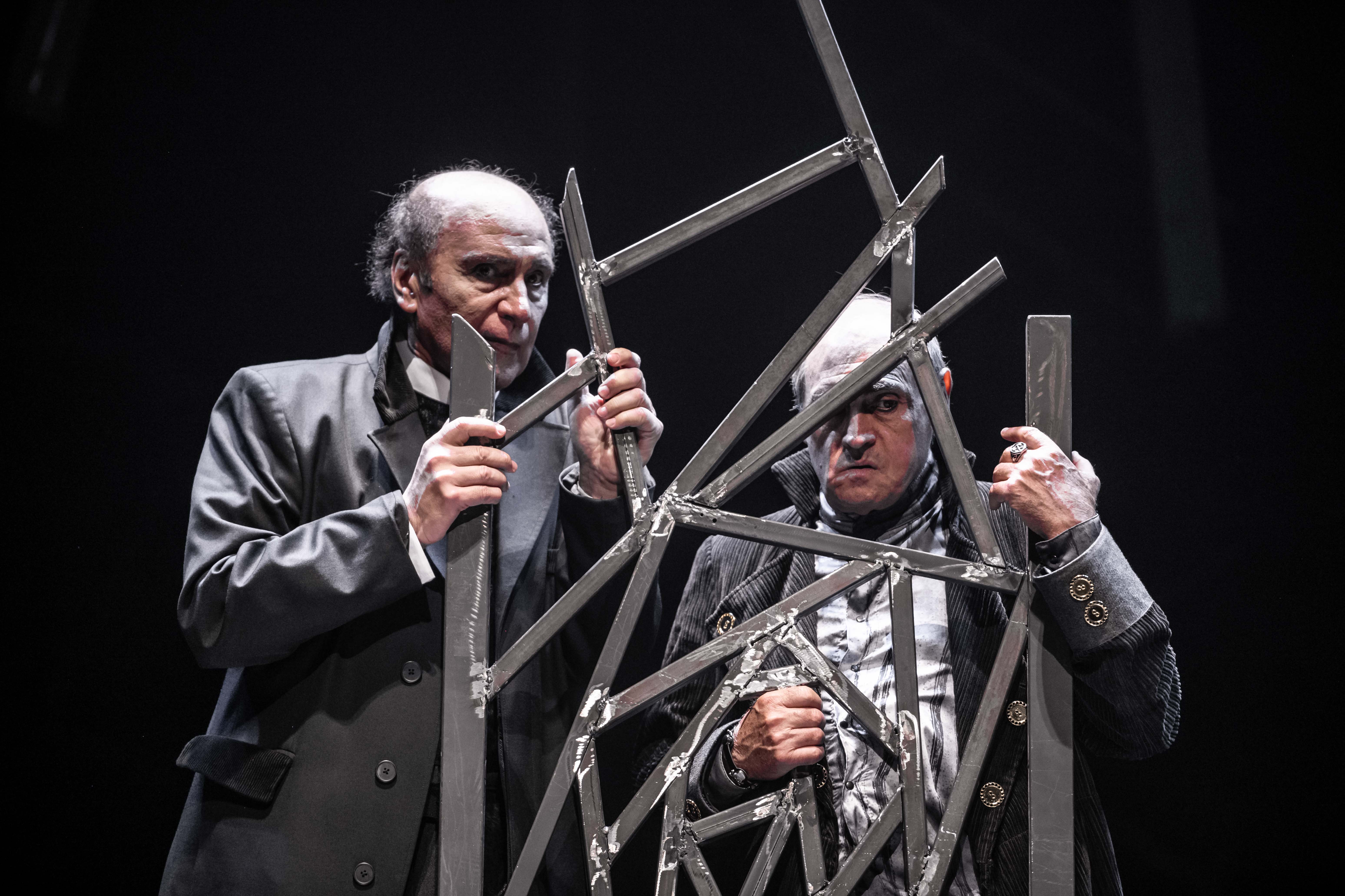 Al entrar a la sala se observa en el escenario sillas ubicadas unas encima de la otra, sobre dos mesas enormes en el centro de la escena, aún sin comenzar la obra impactan el frío y la quietud de los metales desordenados.