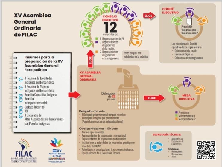 FILAC es un organismo de los 22 países de Iberoamérica, 19 de la región más Bélgica, España y Portugal y representantes de los Pueblos Indígenas. Muyuy hace la precisión respecto a que, la Asamblea General, la máxima instancia de gobierno de este organismo, está constituida por los representantes de los gobiernos de esos 22 países y por 18 representantes de esos Pueblos Indígenas.
